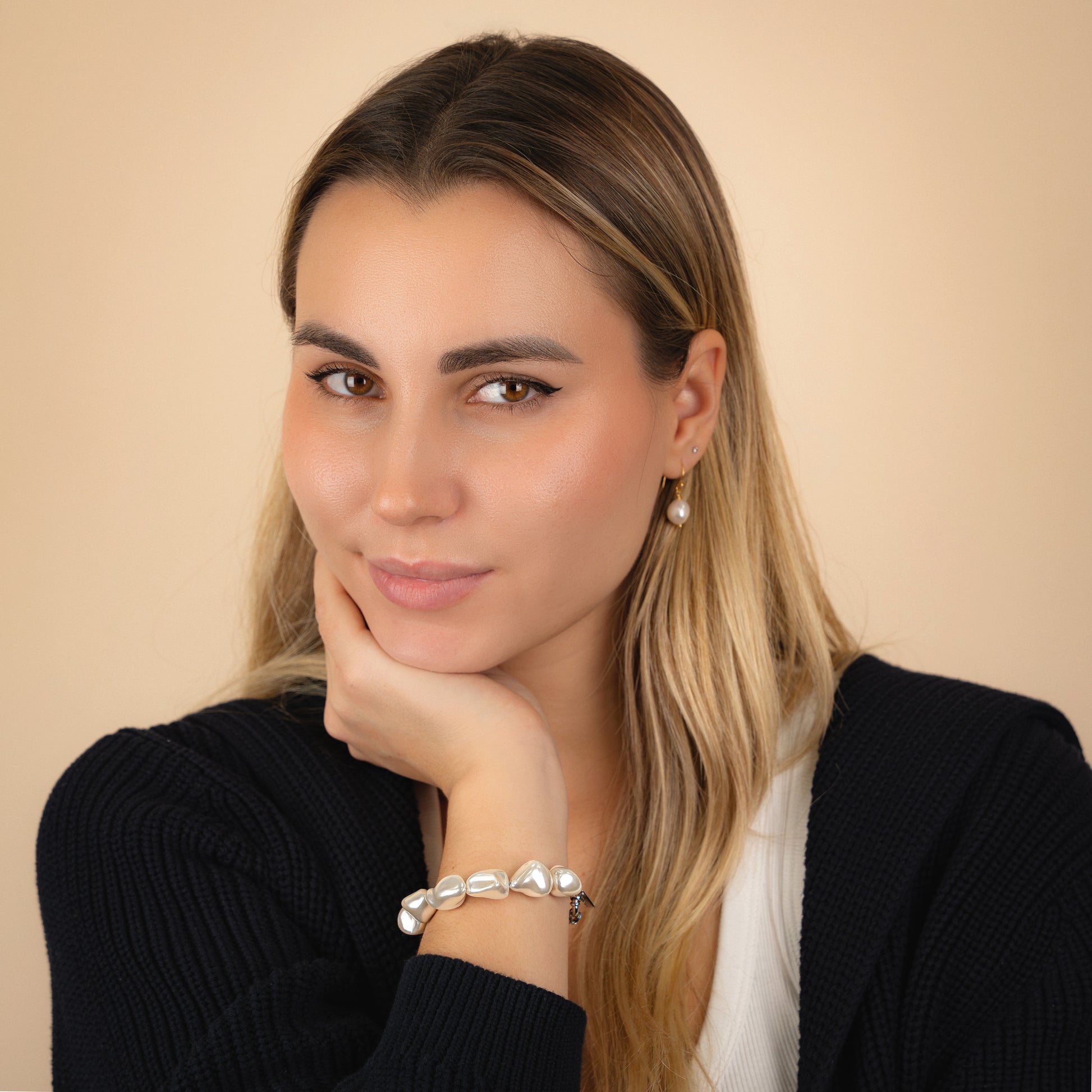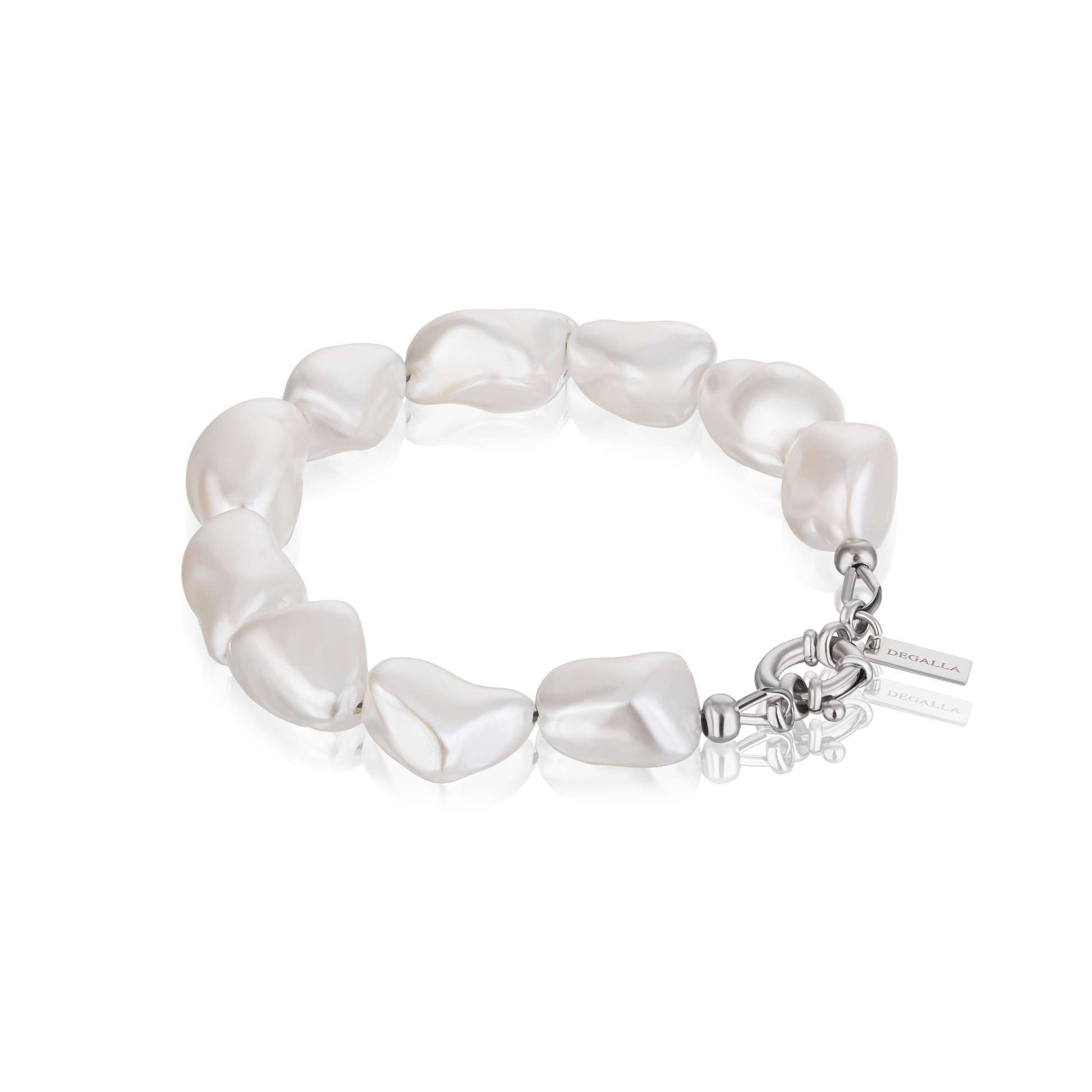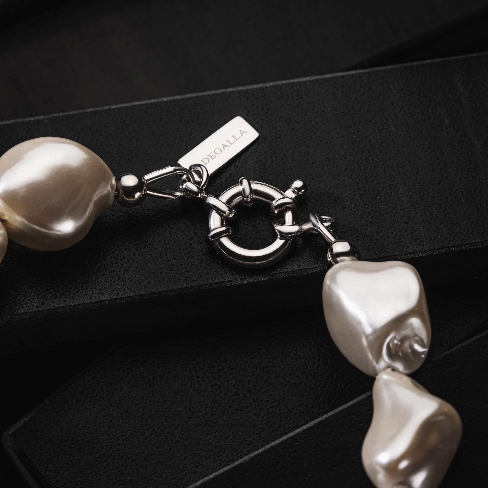 Timeless yet effortlessly modern, this statement bracelet features oversized baroque shell pearls, each one uniquely shaped in an organic silhouette and finished with a classic platinum-plated sterling nautical spring clasp. A striking high-shine piece that elevates any look – from minimal chic to evening glamour.