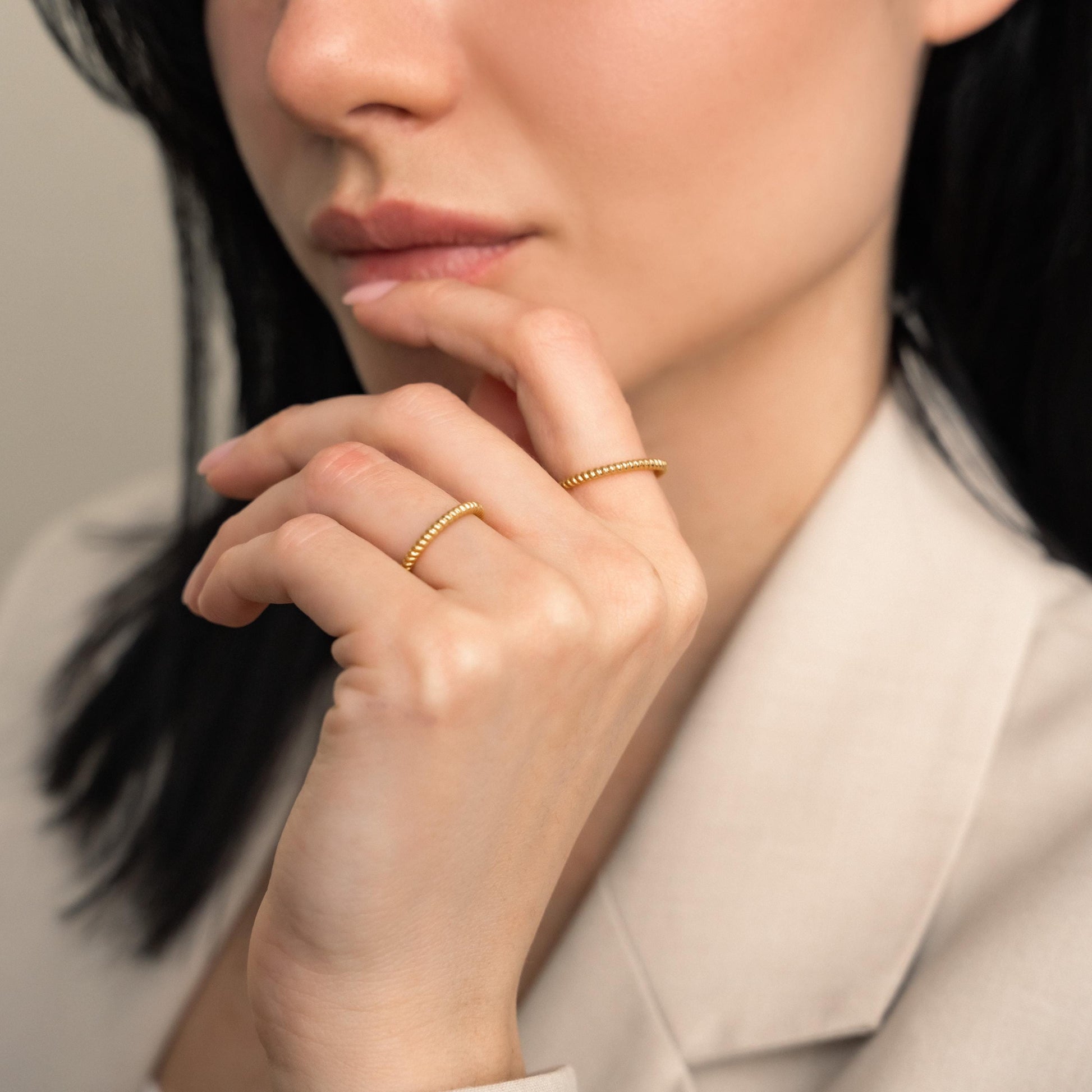 A minimalist, adjustable open band finished with two petite gold spheres for a clean, sculptural look. Wear the opening forward as a subtle accent or turn it back for the simplicity of a classic band. Lightweight, stackable, and perfect on its own or paired with our Diamond-Shaped Gemstone Ring.