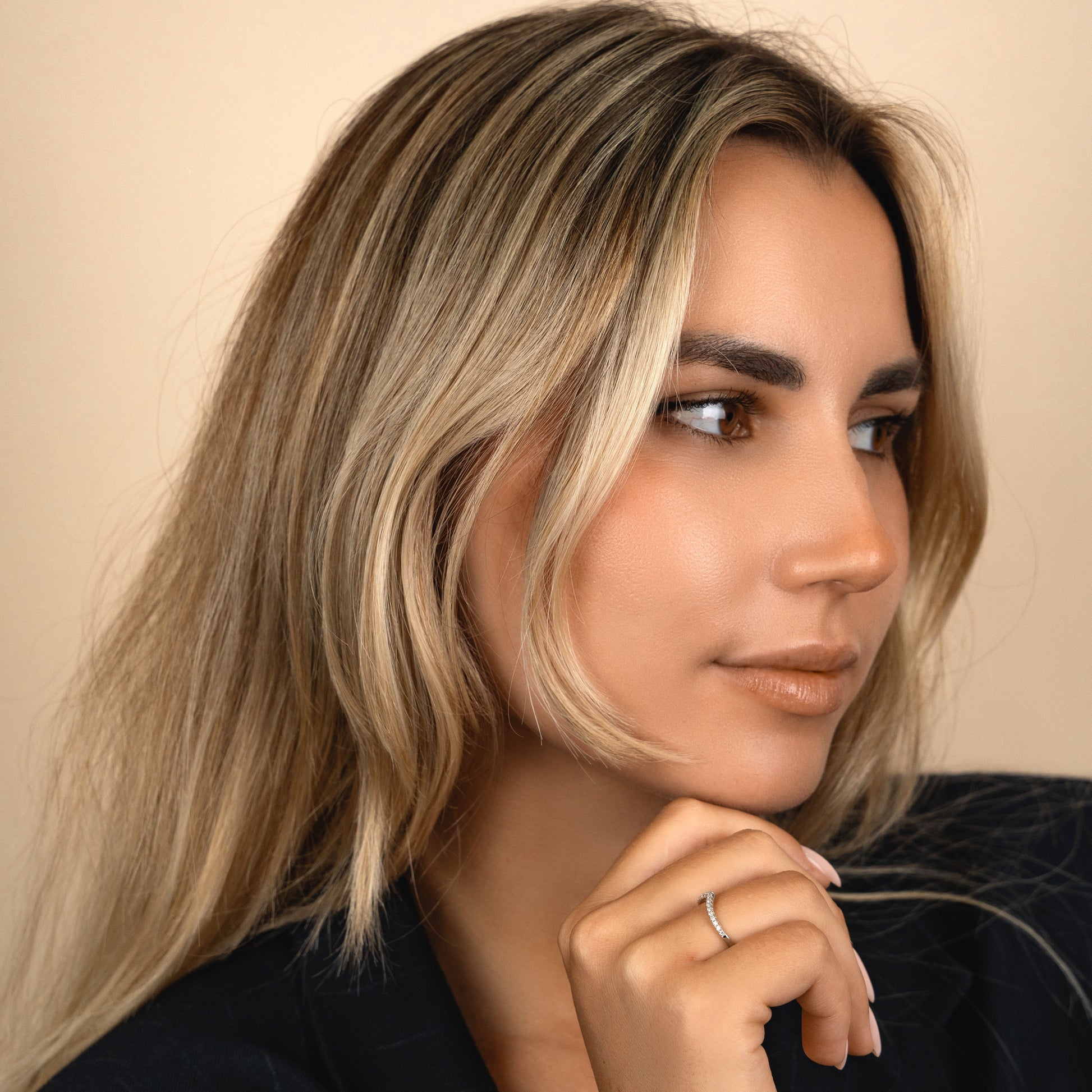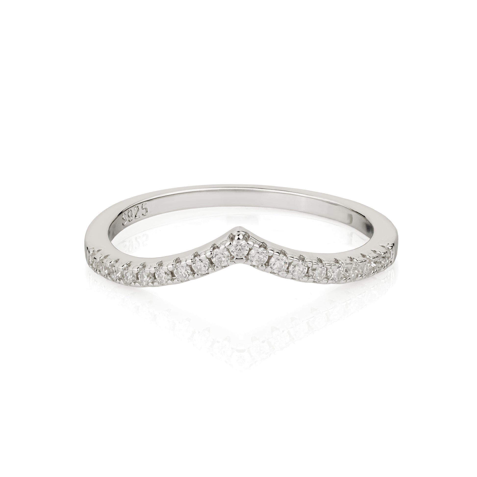 A modern minimalist wishbone band designed for effortless stacking. Crafted in platinum-plated sterling silver and set with round moissanite stones in a delicate prong setting, this V-shaped ring curves elegantly to pair perfectly with solitaire rings. Wear it as a standalone sparkle, stack it with your favorites, or double up to frame your center stone for a custom-styled look.