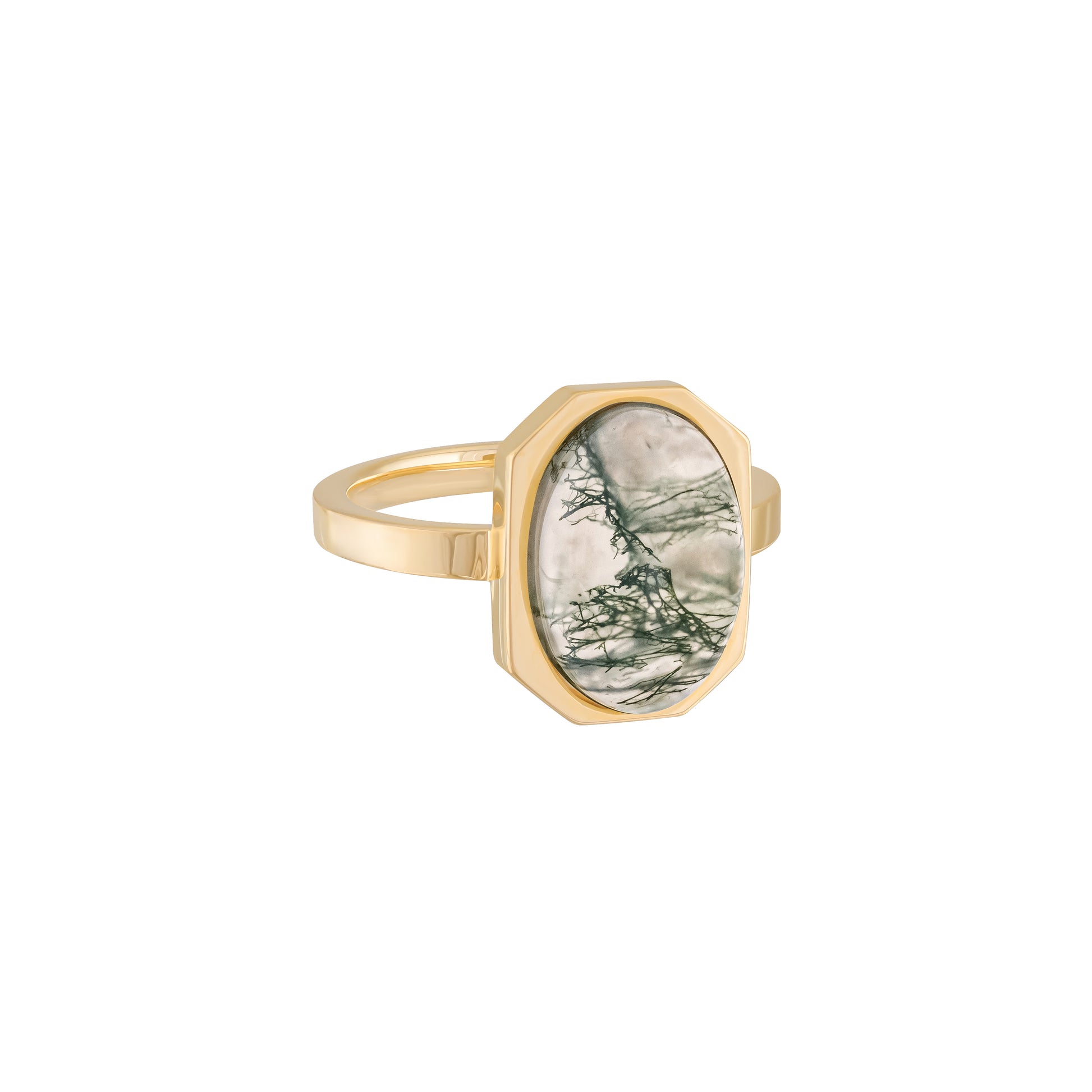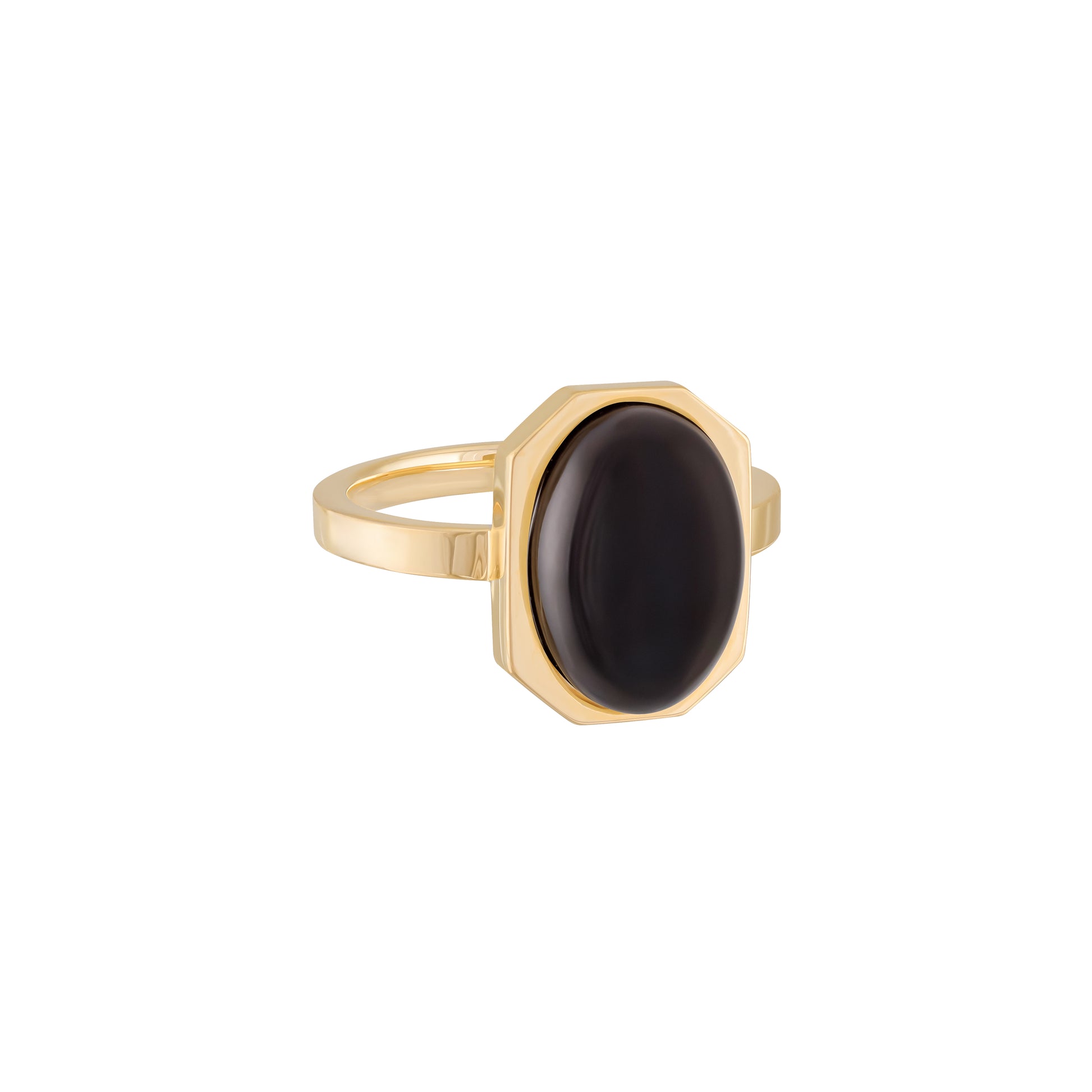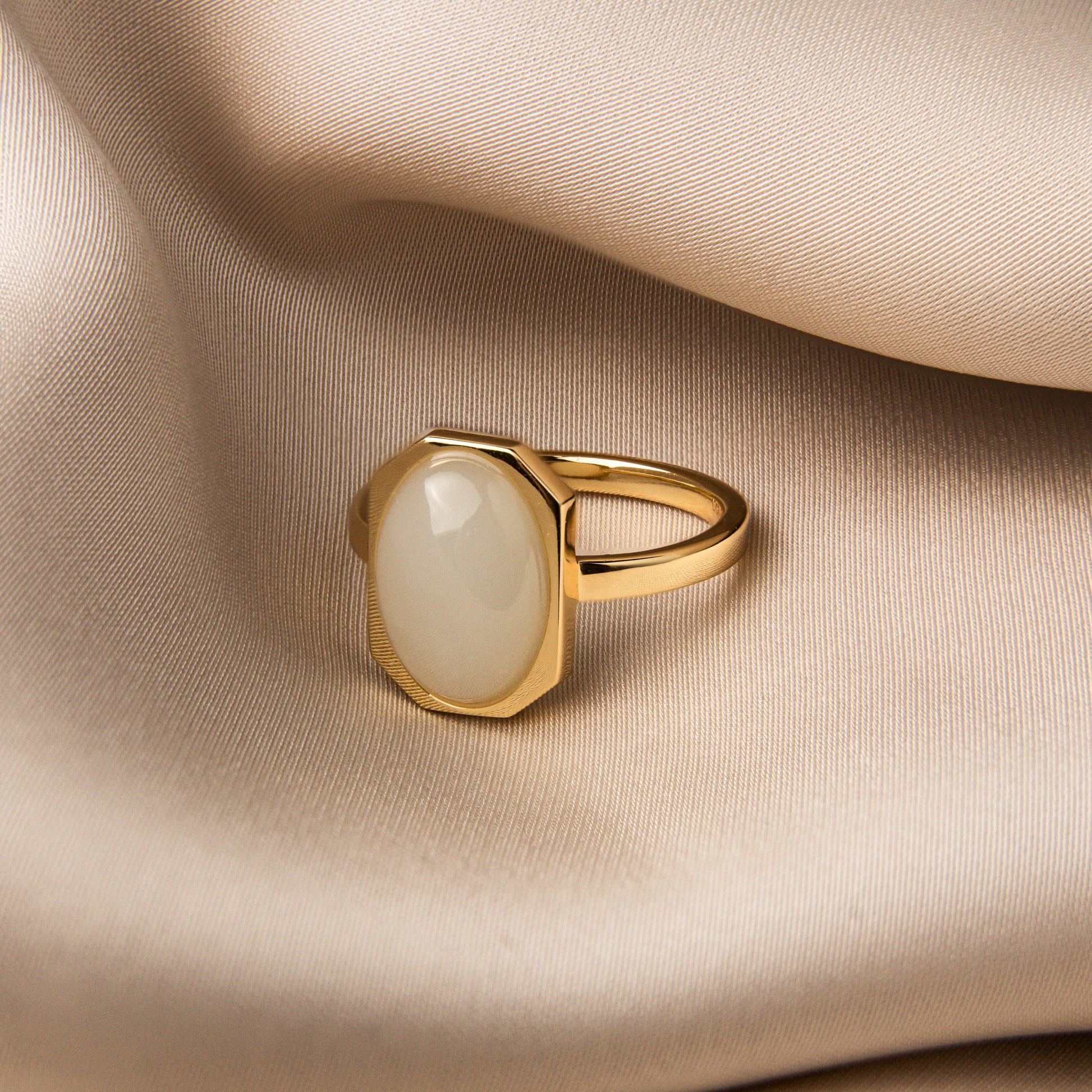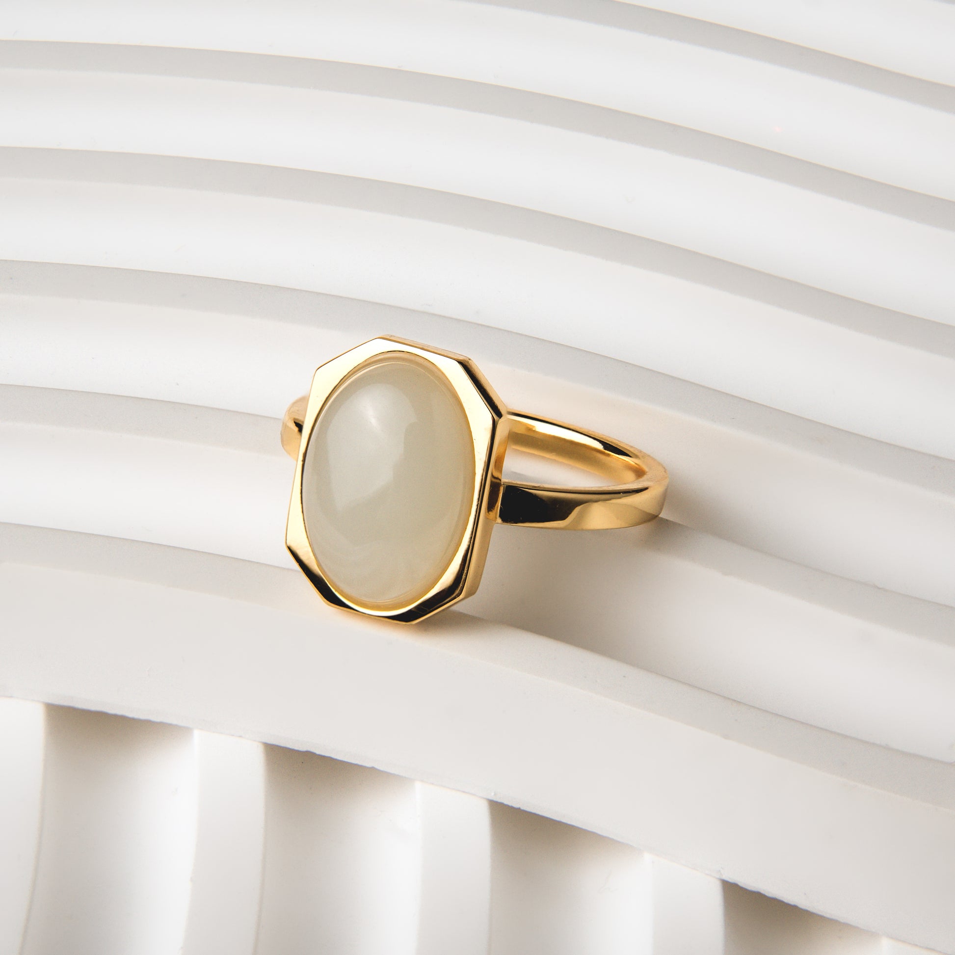 Geometry meets glow. Part of our Art Deco collection, the Halo Ring captures modern glamour in its purest form — an oval-cut semiprecious stone floating inside a crisp octagonal frame of 18k gold-plated sterling silver. A study in balance and proportion, this piece plays with light and reflection like wearable sculpture.