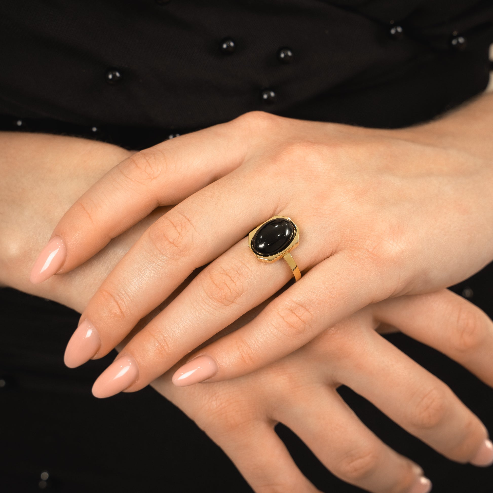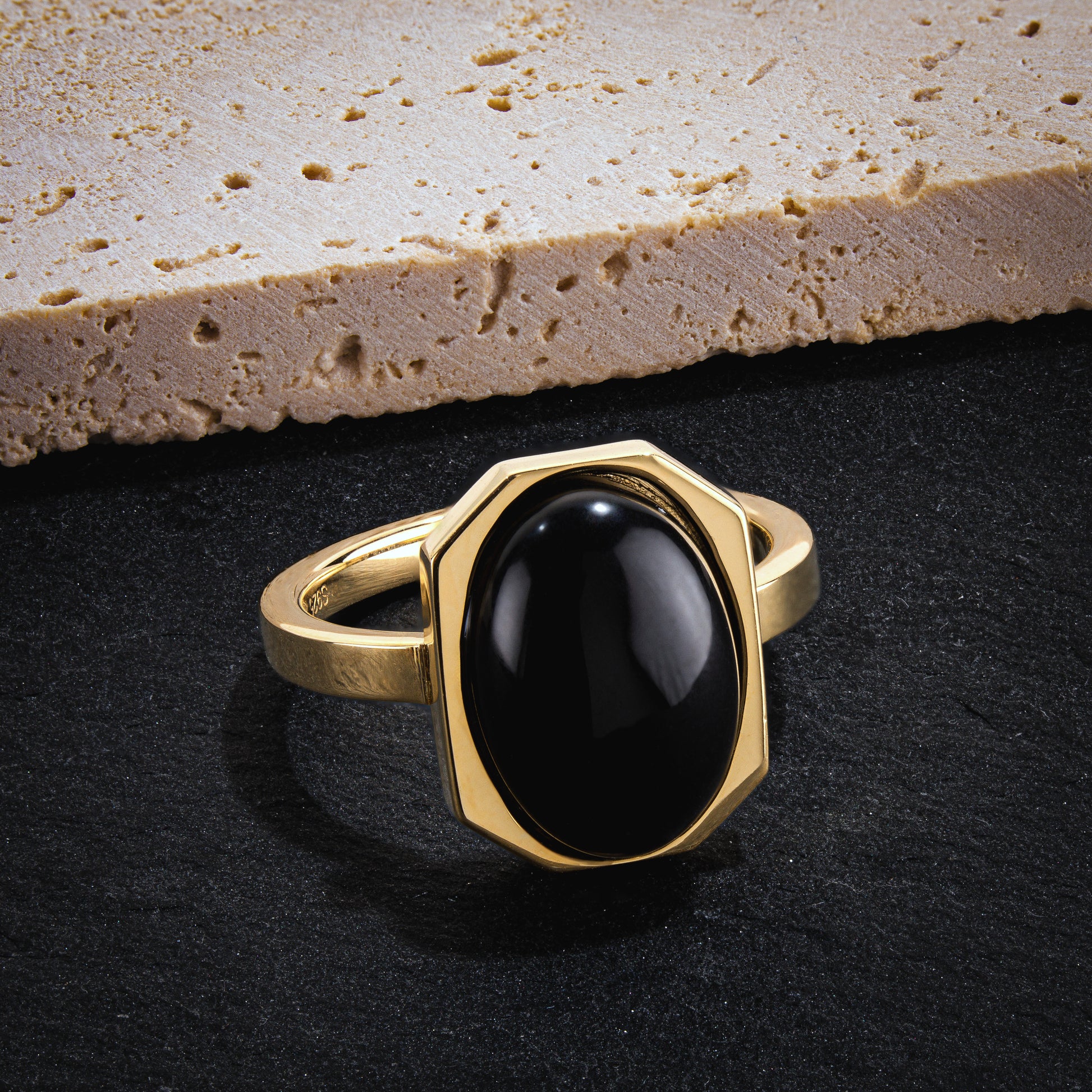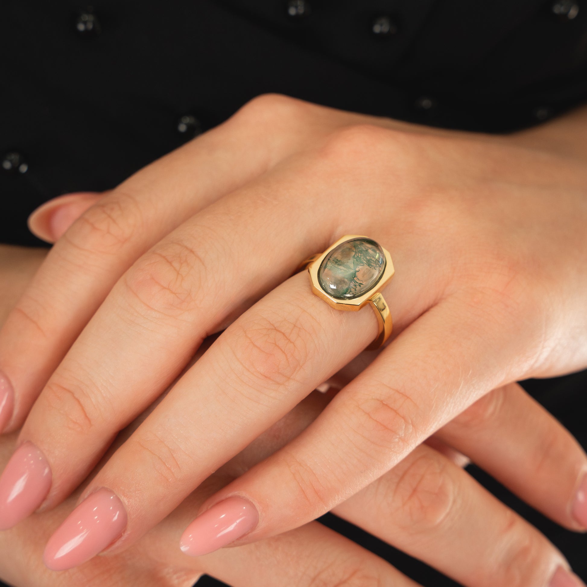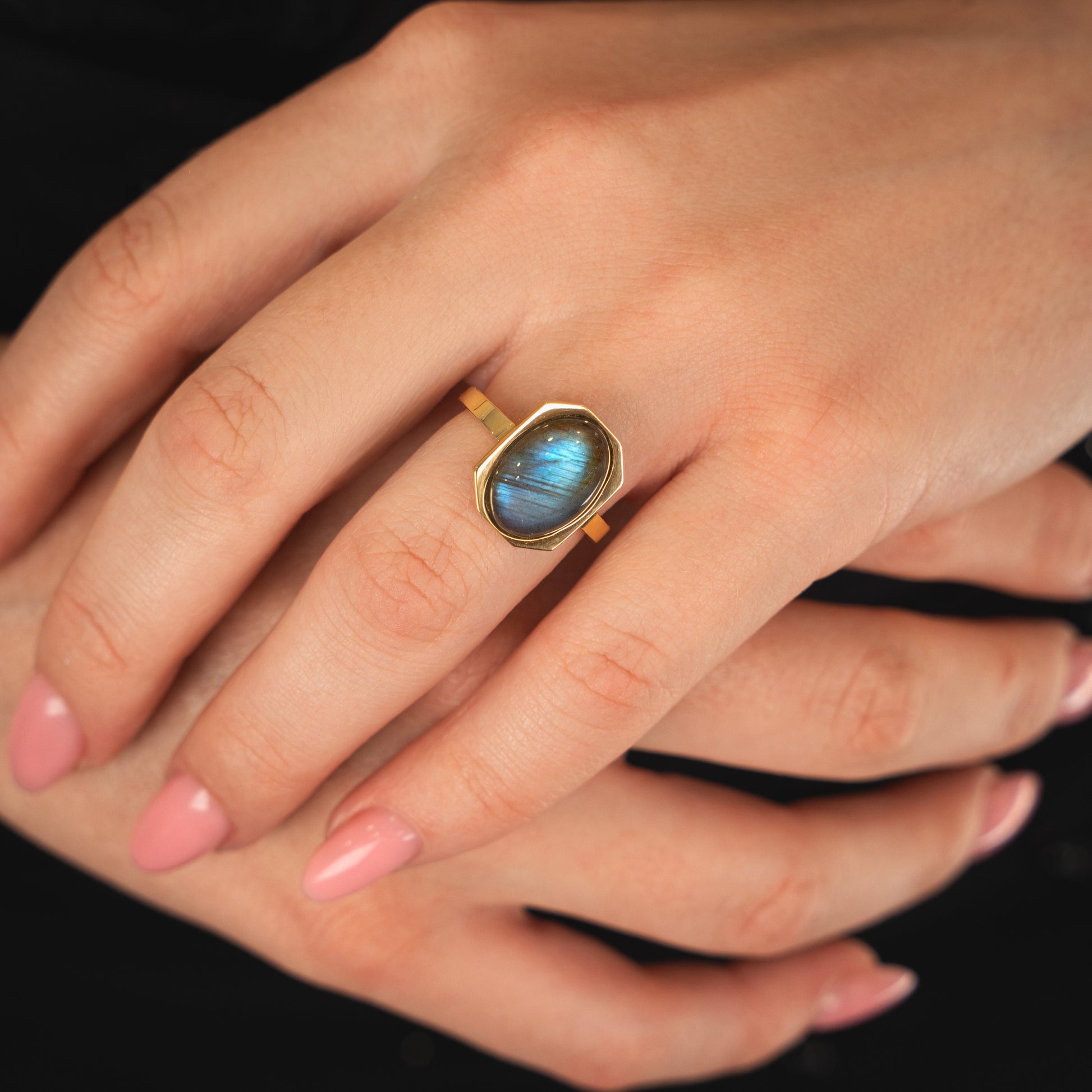 Geometry meets glow. Part of our Art Deco collection, the Halo Ring captures modern glamour in its purest form — an oval-cut semiprecious stone floating inside a crisp octagonal frame of 18k gold-plated sterling silver. A study in balance and proportion, this piece plays with light and reflection like wearable sculpture.