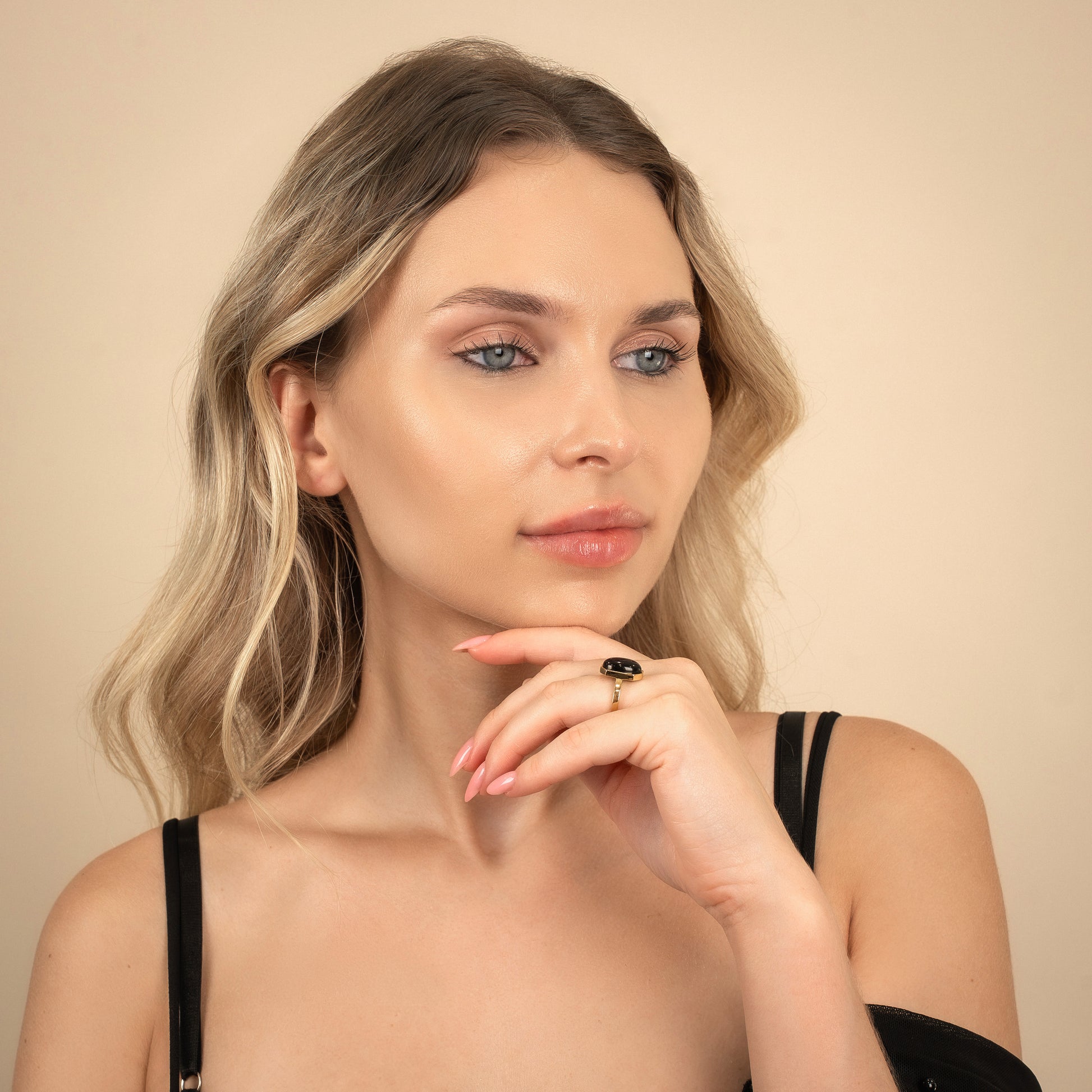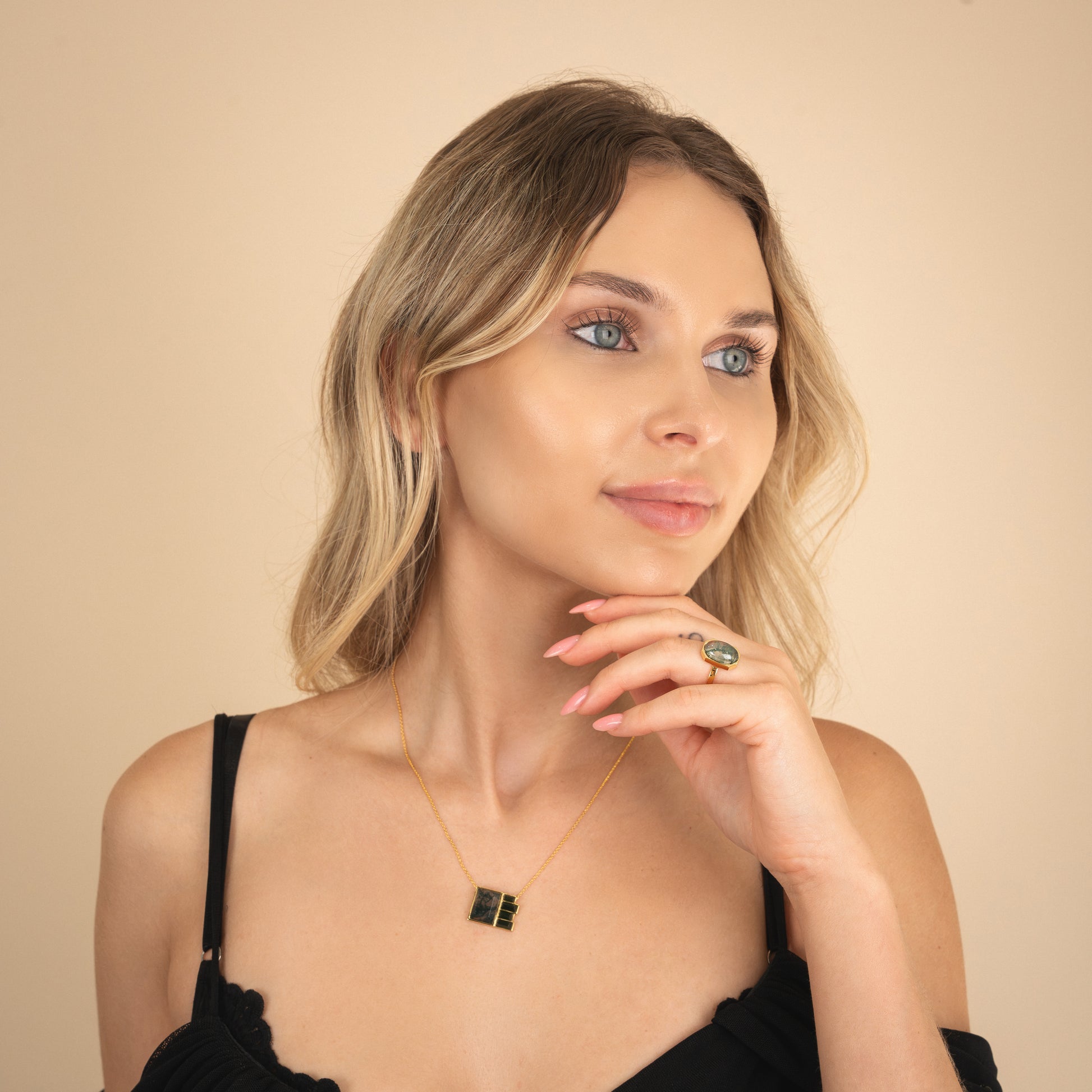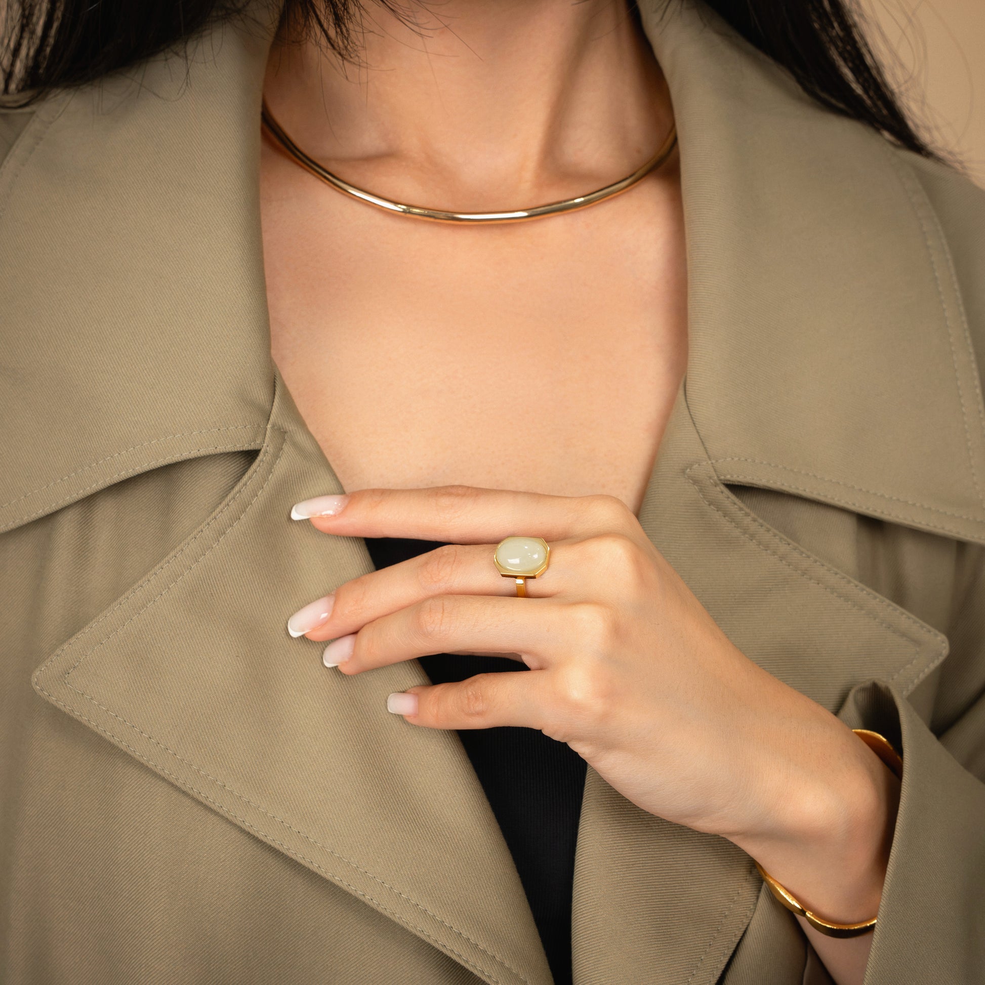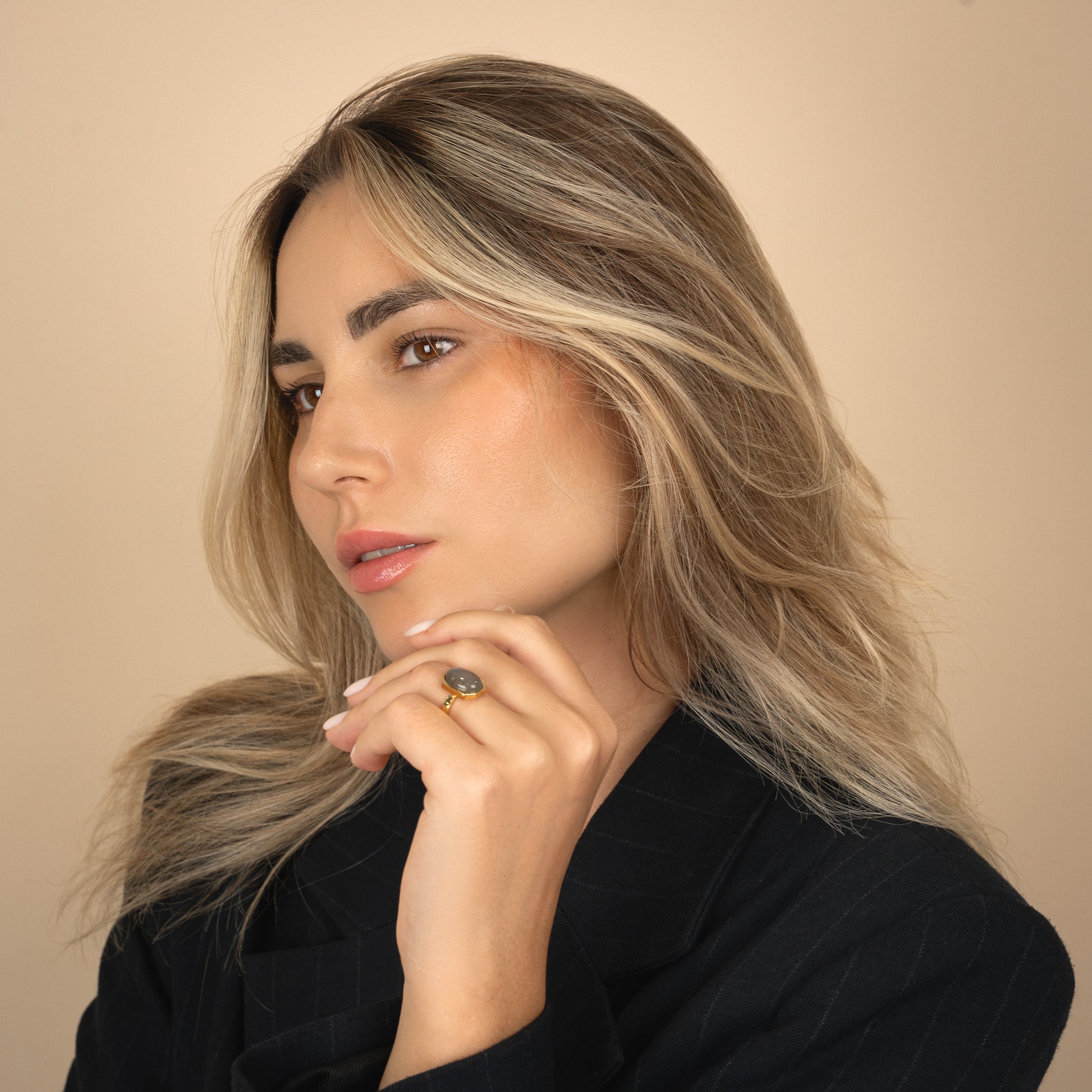 Geometry meets glow. Part of our Art Deco collection, the Halo Ring captures modern glamour in its purest form — an oval-cut semiprecious stone floating inside a crisp octagonal frame of 18k gold-plated sterling silver. A study in balance and proportion, this piece plays with light and reflection like wearable sculpture.